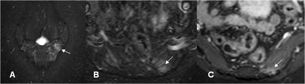 B: RM axial en STIR y C: RM axial en T1 STIR, con contraste. Aumento en la señal en la inserción del músculo piramidal, con realce del contraste, por entesitis.