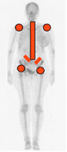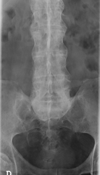 A: Rx AP. Zona de esclerosis, sobre la sacroiliaca derecha.