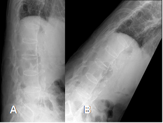 A y B: Rx AP. La parte anterior de los cuerpos vertebrales es “cuadrada”, cambios que sugieren espondilitis anquilosante inicial.