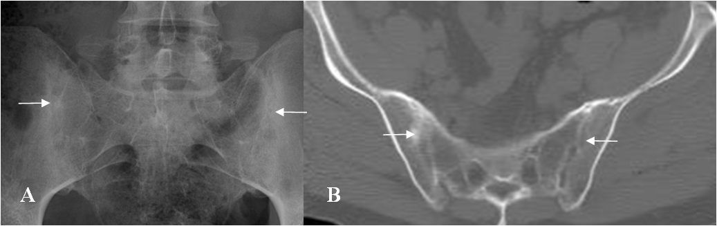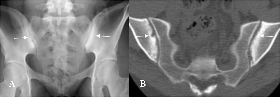 A: Rx AP y B: TAC axial. Esclerosis y erosión de los componentes iliacos, de ambas articulaciones, por espondilitis anquilosante.