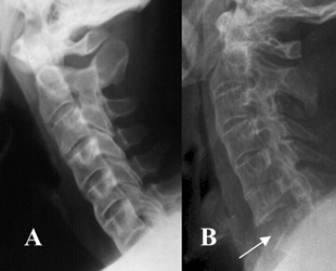 En la anquilosis severa, pueden producirse fracturas en el segmento cervical. (1). (Fig 56 G y 56 H).