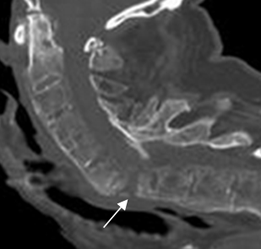 B: TAC reconstrucción sagital. Antecedente de trauma y no visualización de C7 en la Rx simple. Se identifica aumento del espacio C6-C7, con retropulsión del cuerpo, por lesión traumática.