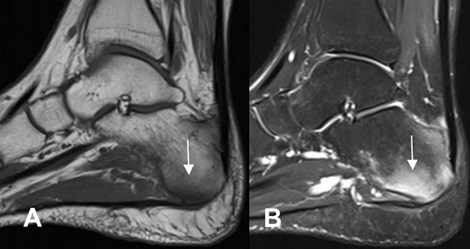 A: RM sagital en T1 y B: RM sagital en STIR. Edema óseo del calcáneo, en un paciente con EA.