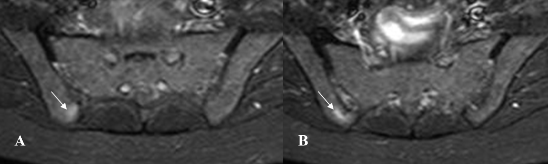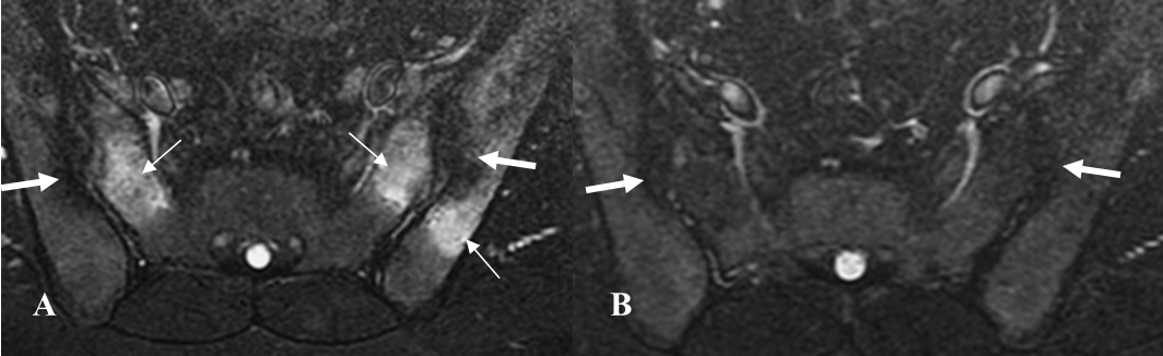 A y B: RM coronal en STIR. Lesiones agudas bilaterales, en A. Si solo se encontrara la lesión del lado izquierdo, esta tendría que verse en 2 cortes consecutivos, para ser considerada positiva. (Flechas delgadas).