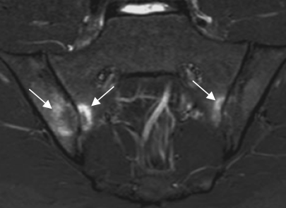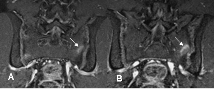 Los nuevos criterios de la Assessment of SpondyloArthritis international Society (ASAS), incluye la RM para facilitar el diagnóstico temprano, iniciar la terapia precoz y prevenir el daño estructural. La respuesta al tratamiento de la sacroileitis, también se puede monitorear, con esta prueba. (20, 21). (Fig 58 A).