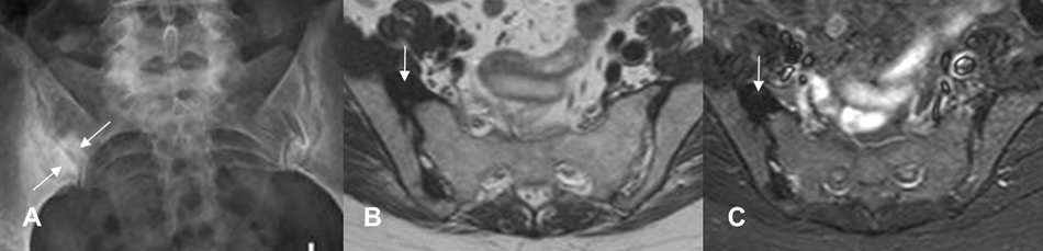 La afección de las articulaciones sacroiliacas, puede ser la manifestación inicial de la enfermedad. (20). Durante la evolución de la enfermedad, el compromiso termina siendo bilateral y simétrico. Si estas no están afectadas, casi que se puede excluir el Dx de EA. (1). (Fig 57 B y 57 C).