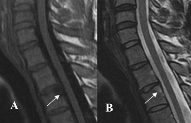A: RM sagital en T1 y B: RM sagital en T2. Lesión en la esquina posterior del cuerpo vertebral cervical, hipointenso en T1 e hiperintenso en T2, por lesión Romanus de evolución aguda.