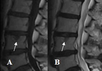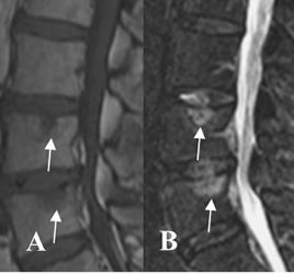 A: RM sagital en T1 y B: RM sagital en T1 STIR con contraste. Lesiones en las esquinas de las vértebras, hipointensas en T1 y con realce del contraste, por lesiones Romanus de evolución aguda. En la parte anterior de L5, hay otras lesiones hiperintensas en T1 y sin realce, por depósito graso.