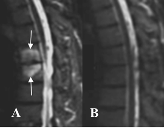 A y B: RM STIR. Edema trabecular de las placas terminales y rodeando un espacio intervertebral, por espondilodisquitis. En un control 10 meses después de iniciar el tratamiento, han desaparecido los cambios inflamatorios.