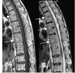 A: RM sagital en T1 y B: RM sagital en T2. Lesiones en las esquinas de las vértebras hipointensas en T1 e hiperintensas en T2, por lesiones Romanus de evolución aguda. Hay otras lesiones hiperintensas en ambas secuencias, por evolución subaguda.