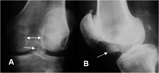B: Rx lateral. Cambios degenerativos en la articulación femoropatelar.