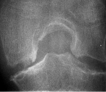 Rx de túnel. Osteopenia con aumento del espacio intercondileo y erosión de los cóndilos femorales y platillos tibiales.