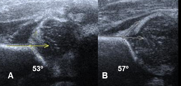 A y B: Ecografías. Angulos alfa entre 50 y 60º, por caderas inmaduras y se recomienda el seguimiento.