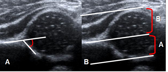 Ecografía. A: Disminución del ángulo alfa (50º) y B: Disminución de la relación A/B, por displasia.
