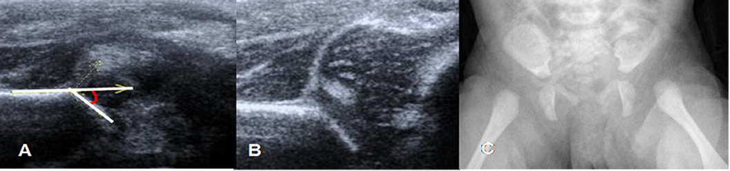 El ángulo alfa es importante para la valoración de la displasia de cadera. Un ángulo mayor de 60º es normal para cualquier edad. Entre 50º y 59º, puede ser normal para niños menores de 3 meses, pero se recomienda el seguimiento y un ángulo menor de 50º, es anormal en cualquier edad. (2). (Fig 33 A).