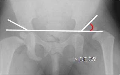 También se mide el ángulo acetabular, formado por la línea que une los cartílagos