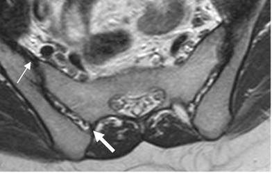 RM axial en T1. Ligamento sacroiliaco anterior (Flecha delgada) y posterior (Flecha gruesa).