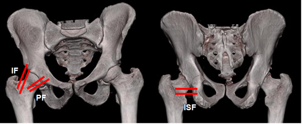 A: TAC 3D vista anterior y B: TAC vista posterior. Ligamentos iliofemoral (IF), pubofemoral (PF) e isquiofemoral (ISF).