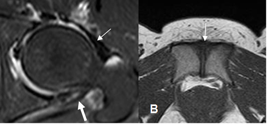 A: ArtroRM axial en STIR. Ligamentos normales iliofemoral (Flecha delgada) e isquiofemoral (Flecha gruesa).