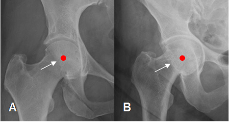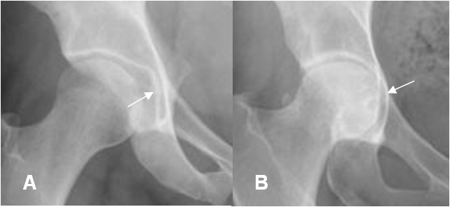 A y B: Rx. El reborde posterior es lateral, al centro de la cabeza femoral.