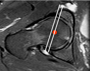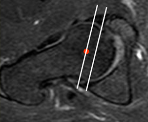 RM axial oblicua. La paralela al centro de la cabeza femoral se localiza lateral, a la línea que une el reborde acetabular oseo anterior y posterior.