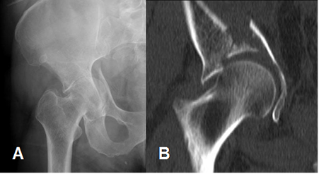 A: Rx AP y B: TAC reconstrucción coronal. Fractura conminuta del techo acetabular, con impactación y desplazamiento medial de la cabeza femoral.