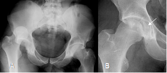 A: Rx AP. Luxación posterior, con desplazamiento superior de la cabeza femoral derecha.