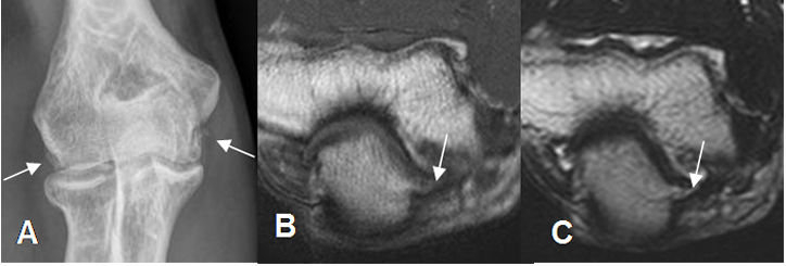 B: RM axial en T1 y C: RM axial en T2. Osteofitos dirigidos hacia el canal del ulnar, con pérdida de la grasa, por compresión del nervio.