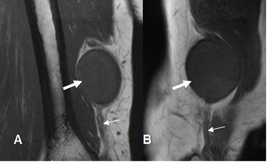 A: RM coronal y B: RM sagital en T1. Imagen ovalada y sólida (Flecha gruesa), en relación con el nervio ulnar. (Flecha delgada.)