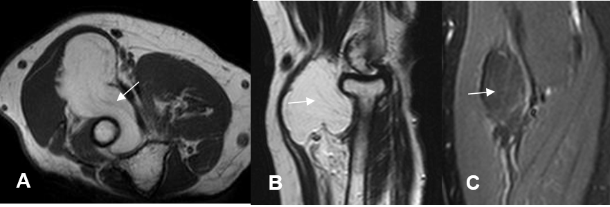 A: RM axial en T1, B: RM sagiltal en T2 y C: RM coronal en STIR. Imagen lobulada que sigue la señal de la grasa y corresponde a lipoma. Rodea el tercio proximal del radio y desplaza el nervio mediano.