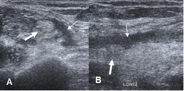 A: Ecografía transversal y B: Ecografía longitudinal. Músculo biceps adelgazado y con pérdida de su patrón fibrilar (Flecha gruesa), rodeado por líquido (Flecha delgada), secundario a ruptura parcial.