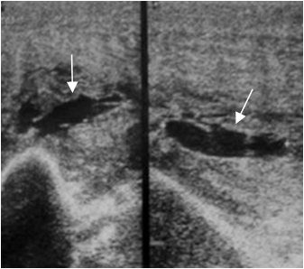 La ecografía tiene las desventajas de ser operador dependiente, su difícil reproductibilidad y la dificultad para valorar completamente el tendón, sobre todo su parte distal. Las ventajas es que permite el estudio comparativo y la exploración dinámica. (15). Con esta modalidad encontramos discontinuidad del tendón y retracción. (Fig 38 A y B).