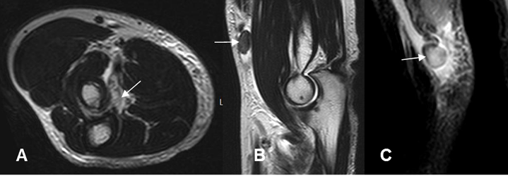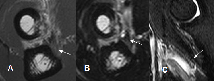 B: RM sagital en T2 y C: RM sagital en STIR. Ruptura retraida del bíceps, con fragmento óseo asociado, por avulsión.