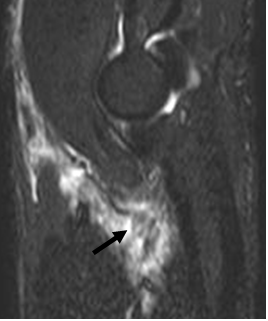 RM sagital en STIR. Ruptura retraída del tendón (Flecha), con cambios inflamatorios asociados.