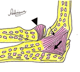 Banda anterior (Flecha delgada) y banda posterior (Flecha gruesa). Ligamento anular del colateral lateral (Cabeza de flecha).