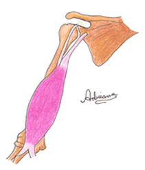 El bíceps braquial está  constituido por una cabeza larga y otra corta. La larga se origina en el tubérculo supraglenoideo de la escápula y la corta, en la apófisis coracoides. Tienen una inserción conjunta, en la tuberosidad del radio y la aponeurosis donde se originan de los flexores de la muñeca. (5). (Fig 3).