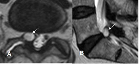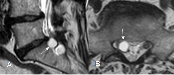 A: RM axial y B: RM sagital en T2. Hipertrofia de articulaciones intervertebrales, con formación de lesión quística yuxta-articular a nivel paramediano derecho, que comprime el saco dural.
