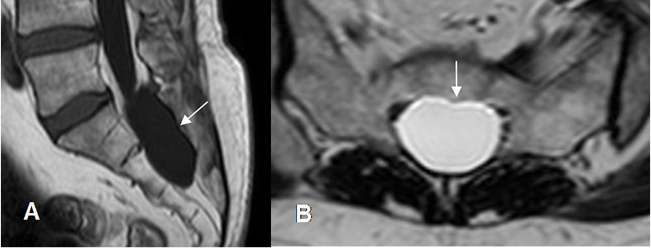 A: RM sagital en T1 y B: RM axial en T2. Lesión ovalada  y de consistencia líquida, que ocupa el canal medular a nivel del sacro.