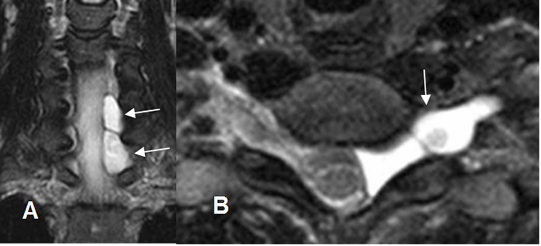 A: RM coronal y B: RM axial en STIR. Formación de seudomeningocele izquierdo, por avulsión de las raíces.