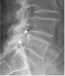 Rx lateral. Hipertrofia de facetas articulares, con disminución del espacio y esclerosis.