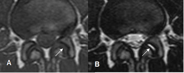 A: RM axial en T1 y B: RM axial en T2. Cambios degenerativos incipientes en la articulación interfacetaria izquierda, con presencia de líquido, hipointenso en T1 e hiperintenso en T2.