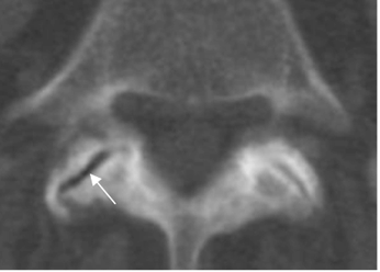 A: TAC axial. Hipertrofia de articulaciones interfacetarias, con fenómeno del vacío en el lado derecho.