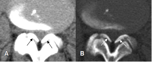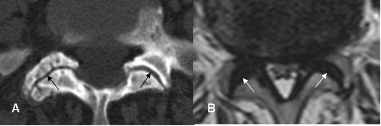 A: TAC axial y B: RM axial en T2. Hipertrofia de articulaciones intervertebrales, con disminución de los espacios interfacetarios.