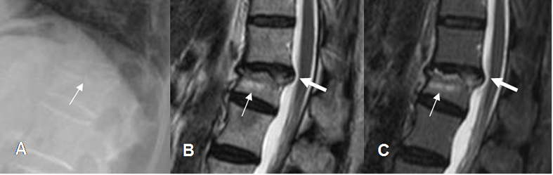 B: RM sagital en T2 y C: RM sagital en STIR. Placa superior hiperintensa, por fractura de evolución aguda. (Flechas delgadas). Se aprecia hernia mediana, que indenta el saco dural. (Flechas gruesas).