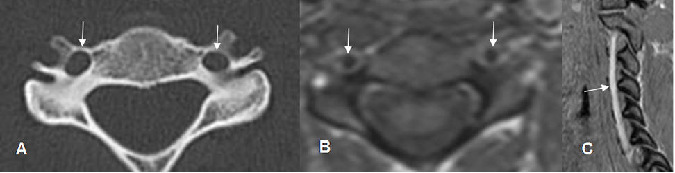 Las lesiones de la arteria vertebral son mas frecuentes entre los segmentos de C2 y C6. La localización del vaso en las apófisis transversas, facilita su trauma durante los mecanismos de rotación y luxación y se recomienda el screening con AngioRM, en los pacientes con este tipo de lesiones. (43). (Fig 211 A y B).