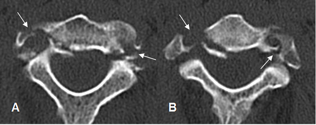 A y B: TAC axial. Fractura de los agujeros vertebrales a nivel bilateral, con diferente grado de desplazamiento y conminución.