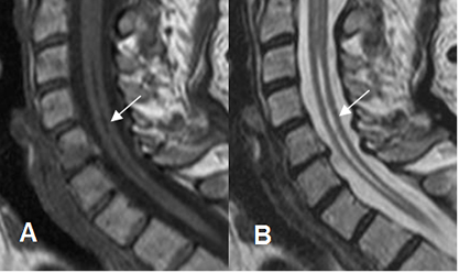 A: RM sagital en T1 y B: RM sagital en T2. Atrofia medular, con cavidad central hipointensa en T1 e hiperintensa en T2, que corresponde a siringomelia.