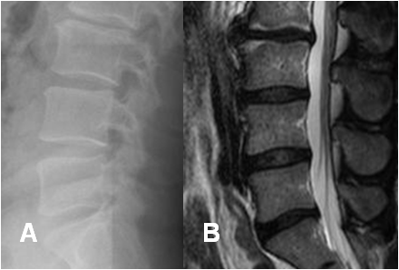 A: Rx lateral y B: RM sagital en T2. Rectificación por espasmo muscular.