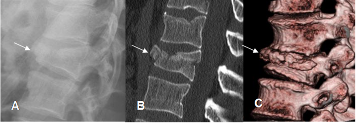 A: Rx lateral, B: TAC reconstrucción sagital y C: TAC reconstrucción en 3D. Fractura por aplastamiento con compromiso de la columna anterior y media y pequeño fragmento retropulsado.