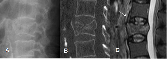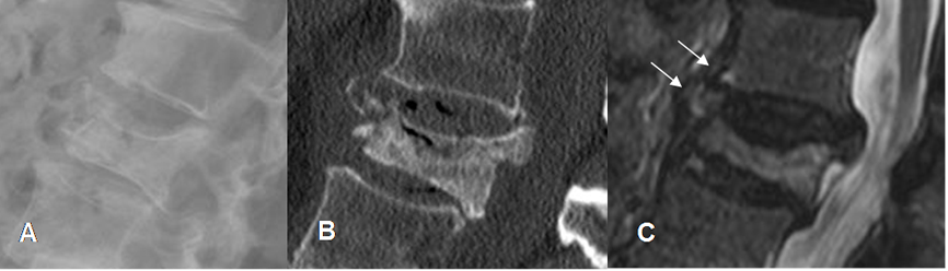 A: Rx lateral, B: TAC reconstrucción sagital y C: RM sagital en T2. Fractura inestable, con fragmento retropulsado. El ligamento común anterior está separado del cuerpo vertebral, pero permanece íntegro.